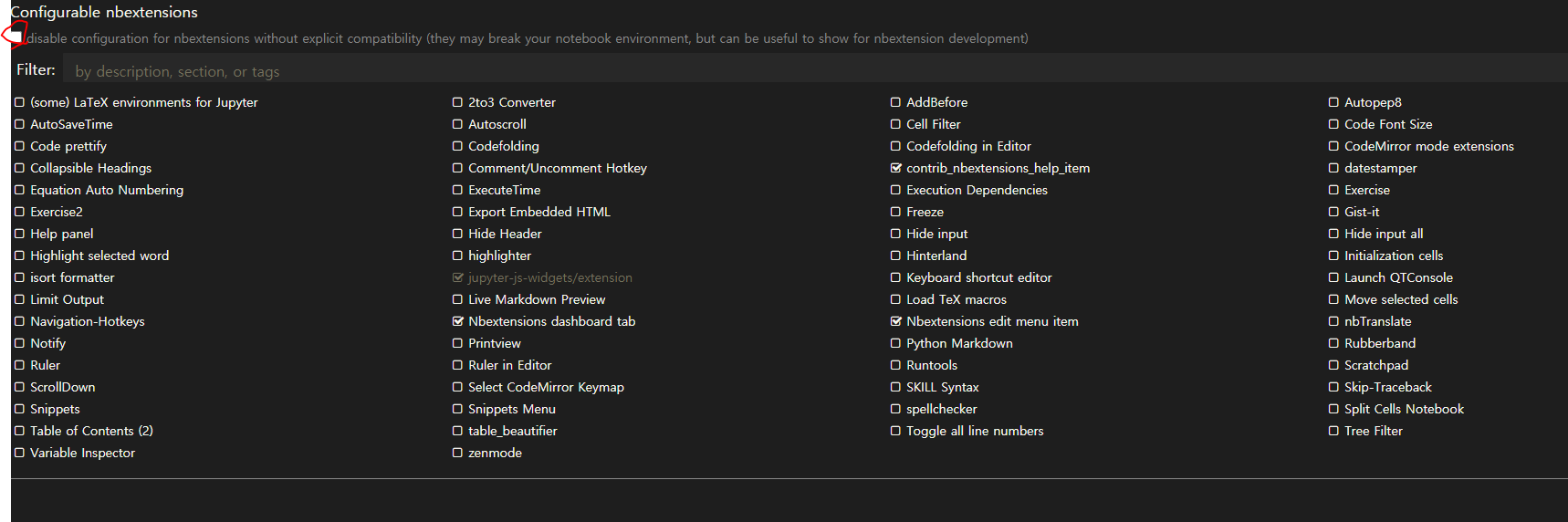 nbextensions config를 클릭하면 아래와 같은 확장 가능 tab들을 볼 수 있다. 여기에서 몇 가지 유용하게 사용하는 것만 체크해준다.