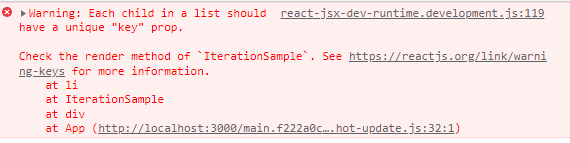 경고 메세지가 나오는 이유는 key가 없기 때문이다. key는 컴포넌트 배열을 렌더링 했을 때 어떤 원소에 변동이 있었는지 알아내려고 사용하는데, key가 없을 때는 임의로 리스트를 순차적으로 비교하며 변화를 감지한다. 따라서 이 과정을 콜백 함수의 인수인 index값을 사용하여 key를 설정하면 어떤 곳에서 변화가 일어났는지 빠르게 알 수 있다.