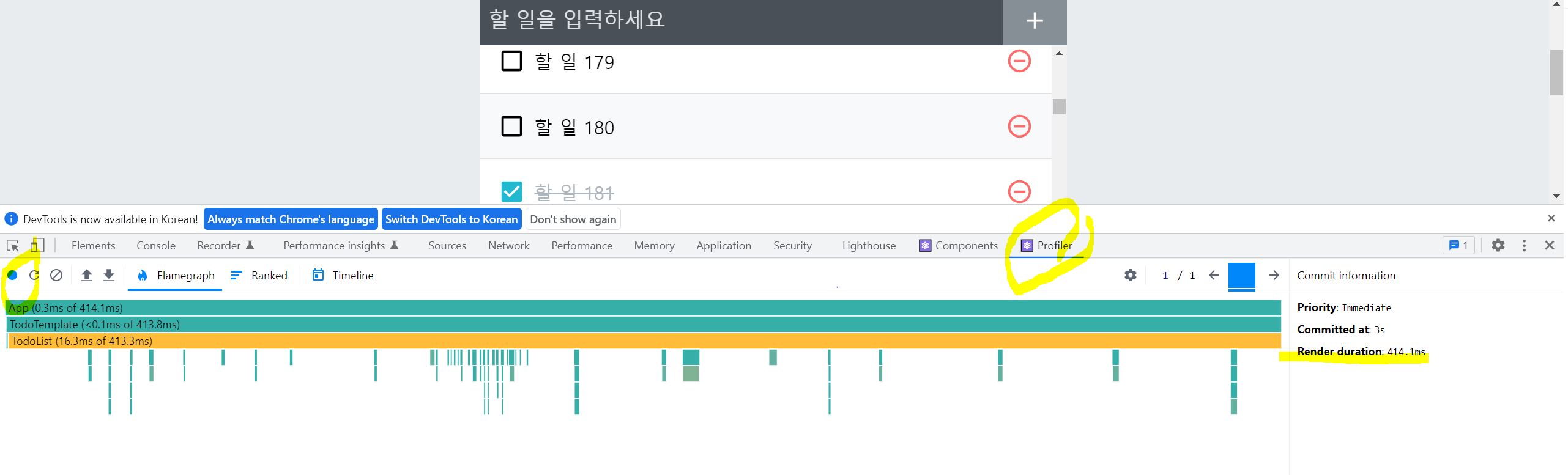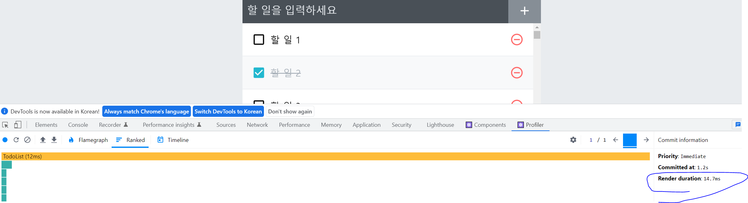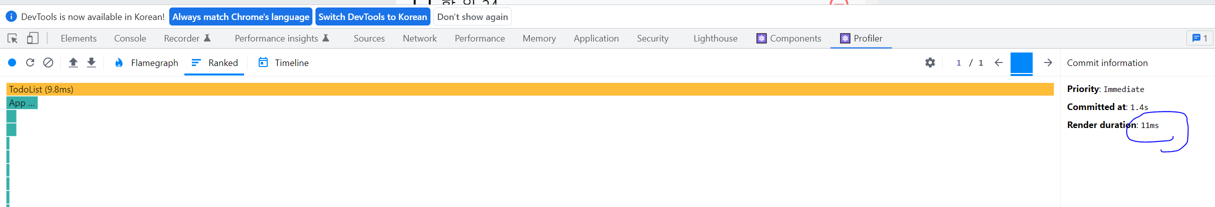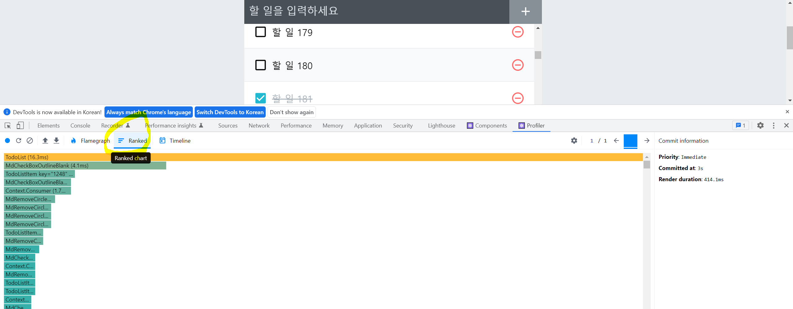 두 번째로, Ranked 버튼을 클릭하면 리렌더링된 컴포넌트를 오래 걸린 순으로 정렬하여 나열해준다.