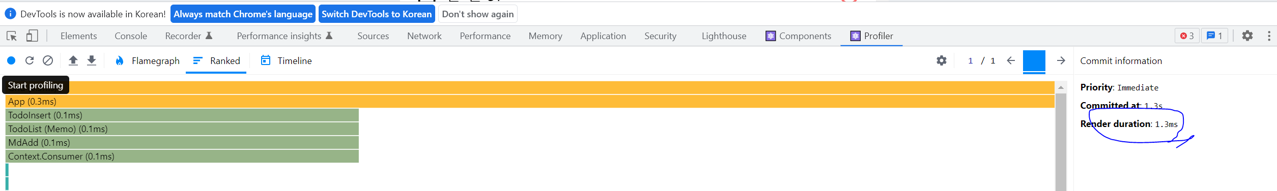 그러면 우측에 Render duration 값을 확인할 수 있다. 이는 리렌더링에 소요된 시간을 의미한다.