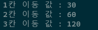 Console.WriteLine("3칸 이동 값 : {0}", result3);