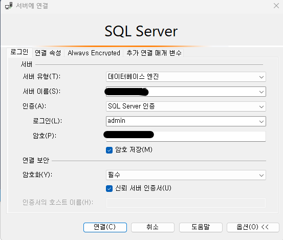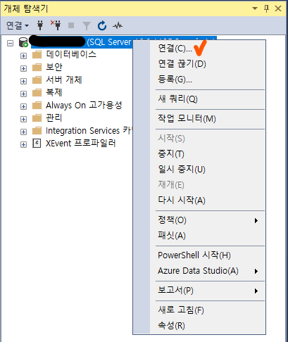 3 ) 서버우클릭 -> 연결 : SQL 인증모드를 사용함에 따라 인증 로그인과 암호를 설정은 서버의 연결에서 진행합니다.