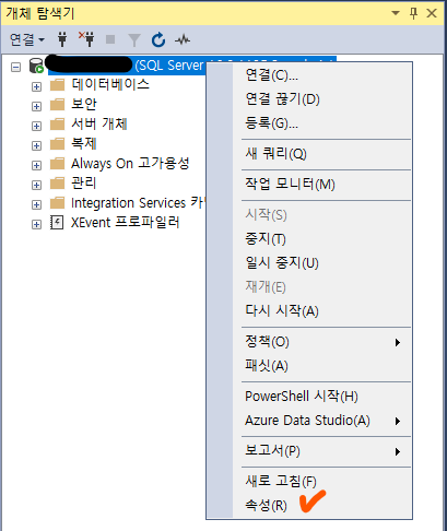 1) 서버 우클릭 -> 속성