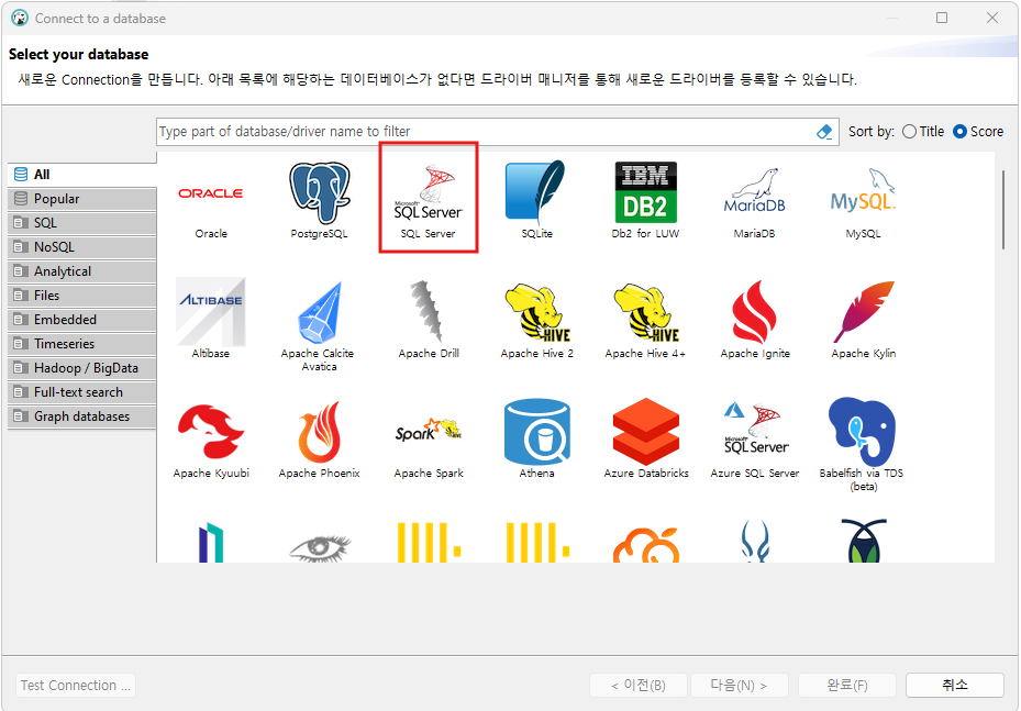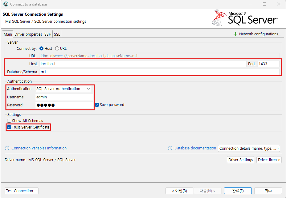 Host에는 SQL Server창에서 설정했던 서버이름을 넣었어요. port는 default에서 변경하지 않았습니다.