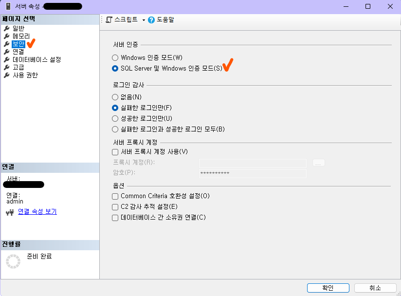 저는 SQL Server인증으로 접속하기 위해 해당 서버의 속성에서 바꿔줬어요