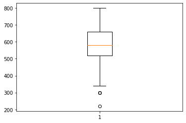 plt.boxplot(df['gre'])