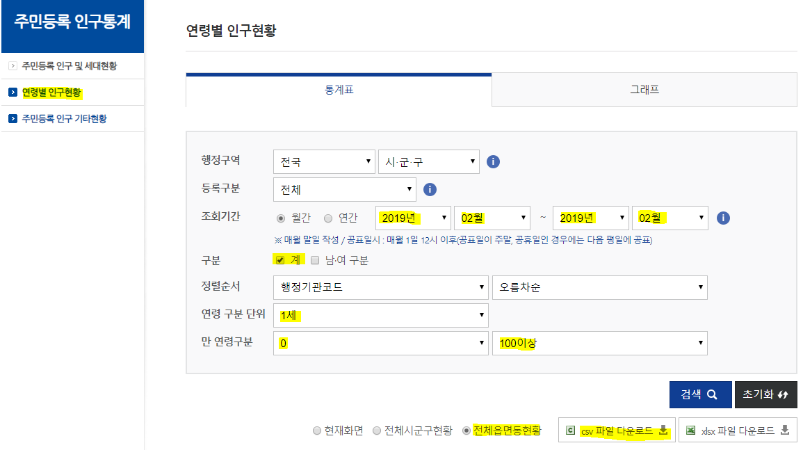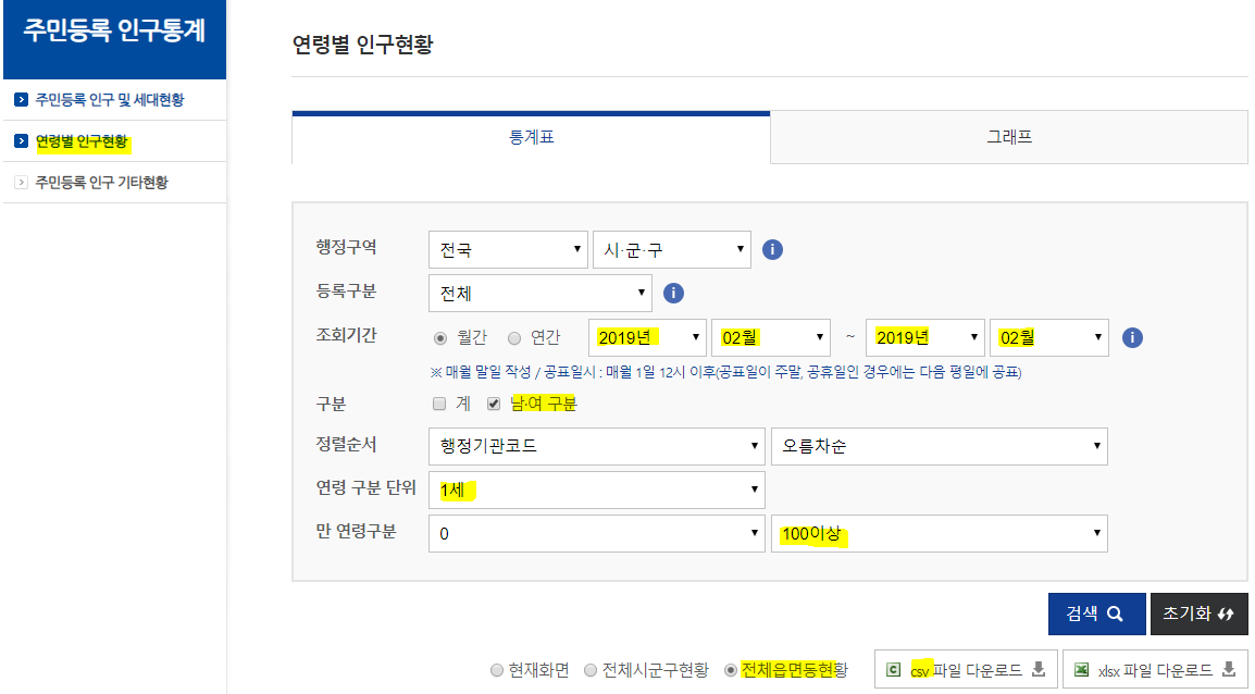 왼쪽의 연령별 인구 현황을 클릭한 뒤, 다음과 같이 설정하였습니다.