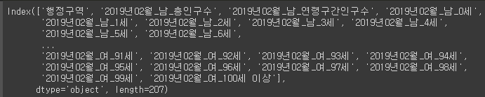 column은 행정구역 + 남_총인구수 + 남_연령구간 인구수 + 0 ~ 100 + 여_총인구수 + 여_연령구간 인구수 + 0 ~ 100 으로 구성되었습니다. 따라서 남자 인구를 구할 때는 column이 3 ~ 103, 여자 인구를 구할 때는 106 ~ 206을 사용해야함을 알게 되었습니다.