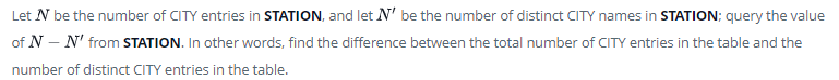 SELECT COUNT(*) - COUNT(distinct CITY)