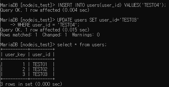 Update : update 를 수행해보기 위해서 위의 데이터에 임의로 TEST04를 INSERT 한 뒤, 이를 TEST03으로 바꿔보자.