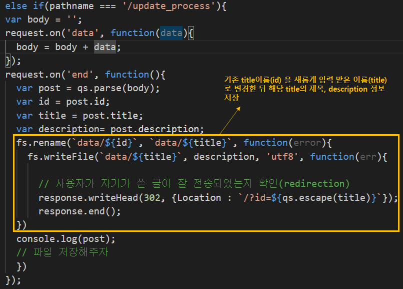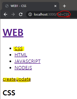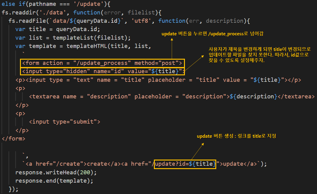 templateHTML 에 맞게 `<a href="/create">create</a><a href="/update?id=${title}">update</a>` 를 넣어준다.