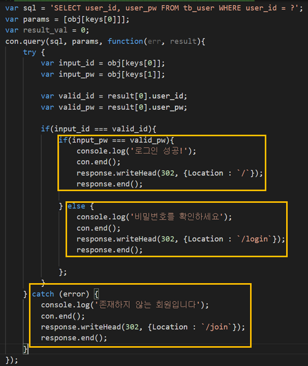 var sql = 'SELECT user_id, user_pw FROM tb_user WHERE user_id = ?';