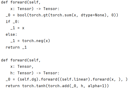 torchscript는 tracing과 다르게 example을 전달하지 않아도 된다. 함수 안에서도 함수를 사용하는 것도 가능해서 모델 구조를 작성할 때 아주 용이할 듯 하다!